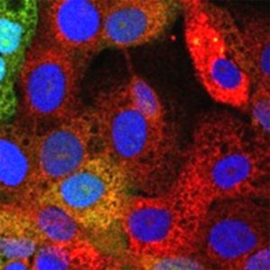 Expresión exacerbada del receptor de glucosa (en tinción roja)